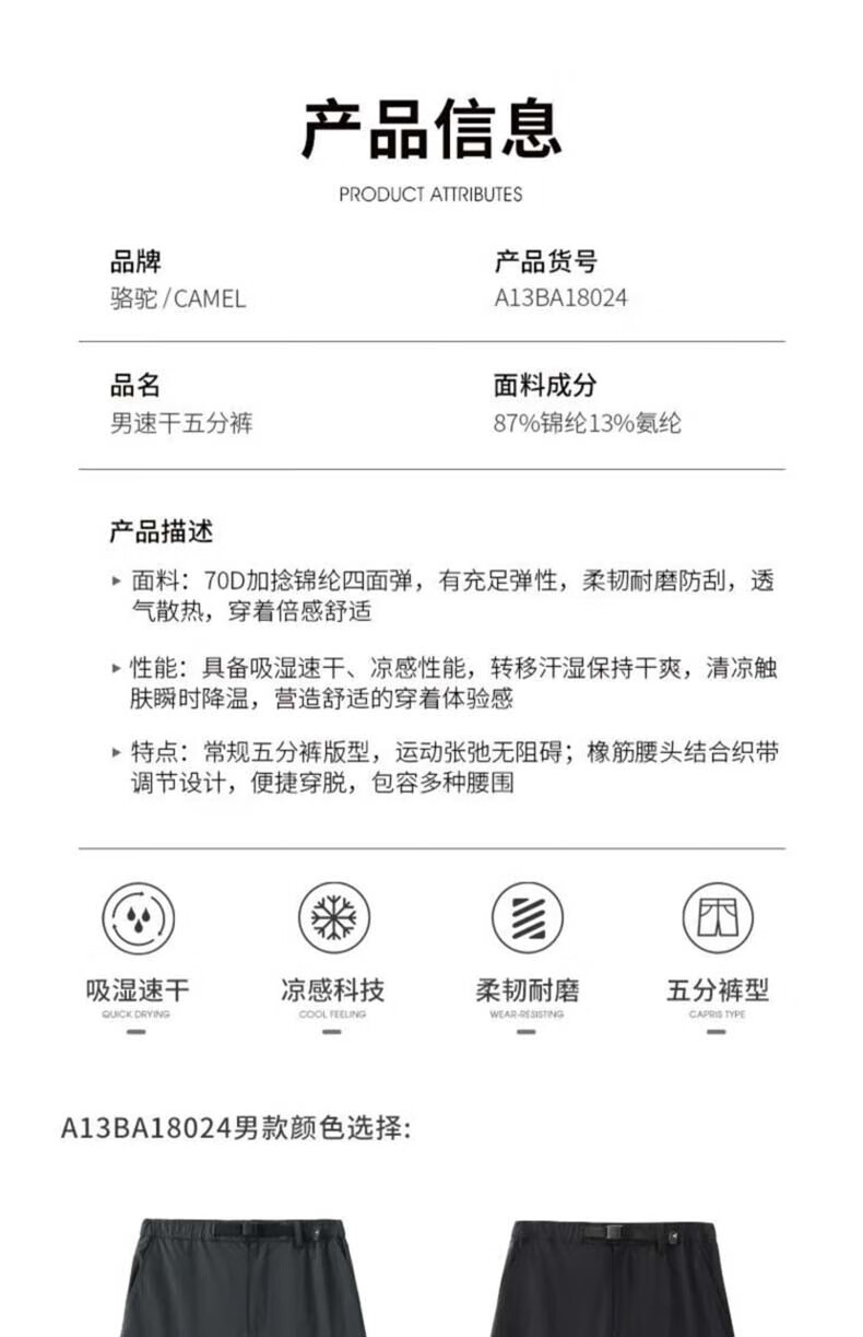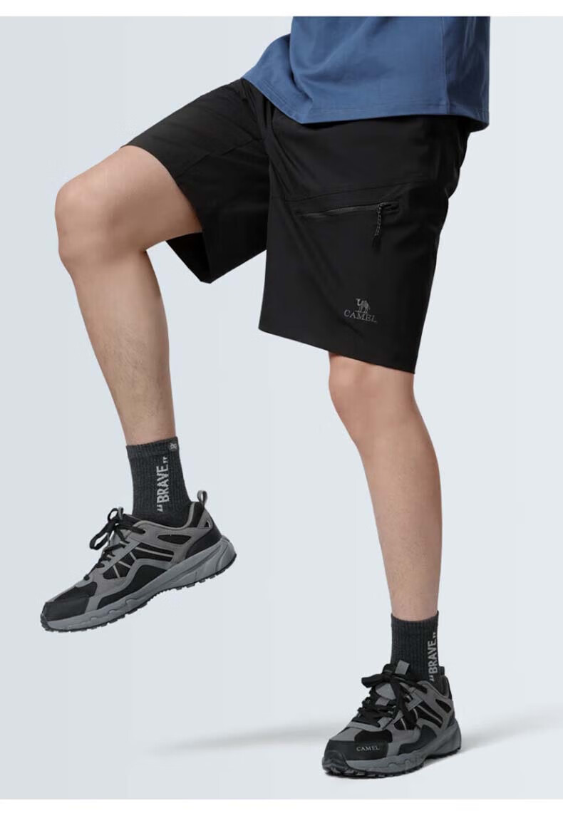 駱駝(CAMEL)【冰膚涼感】戶外男速干五分褲2023春夏冰感彈力短褲子帶腰帶 A13BA18024,墨灰,男 M 自營