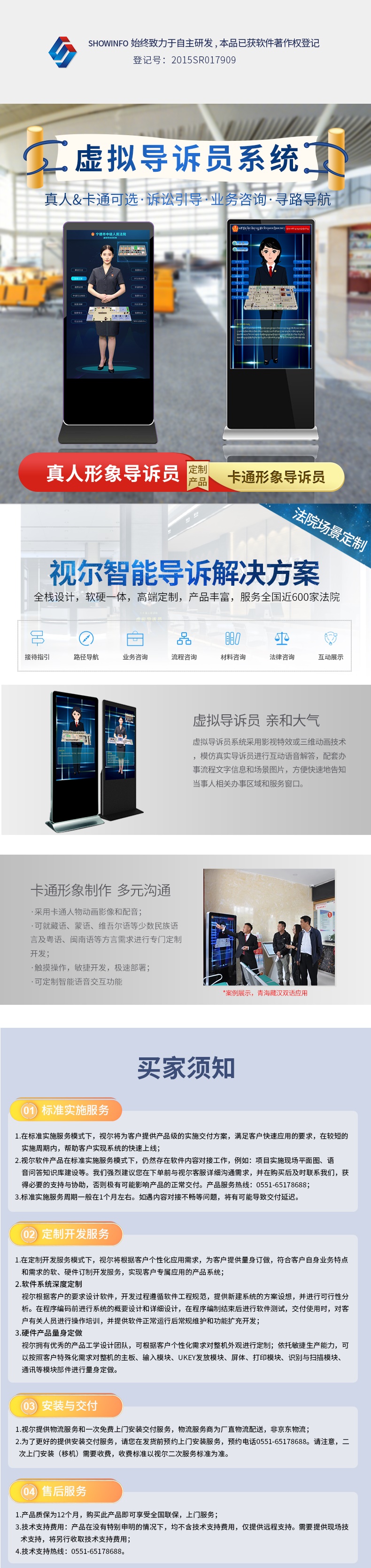 視爾(showinfo)虛擬導(dǎo)訴員系統(tǒng) 卡通形象定制 智能訴訟指引 軟硬一體 標(biāo)準(zhǔn)卡通版 55英寸屏幕 自營
