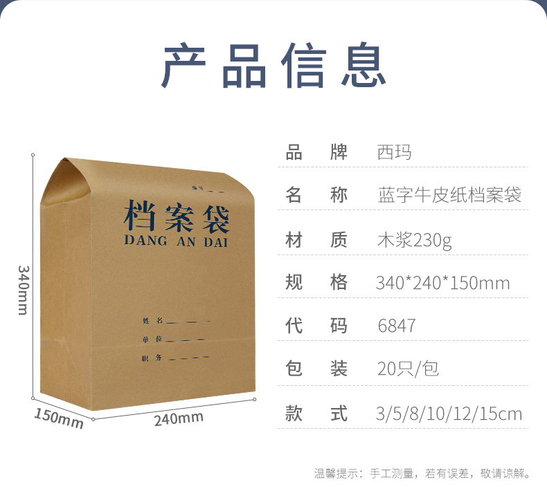 西瑪6847木漿牛皮紙檔案袋藍(lán)字15cm-20 木槳230g 240*340*150mm 20個(gè)/包 20包/箱(紅、藍(lán)兩色下單跟客服聯(lián)系)(整箱售) 自營(yíng)
