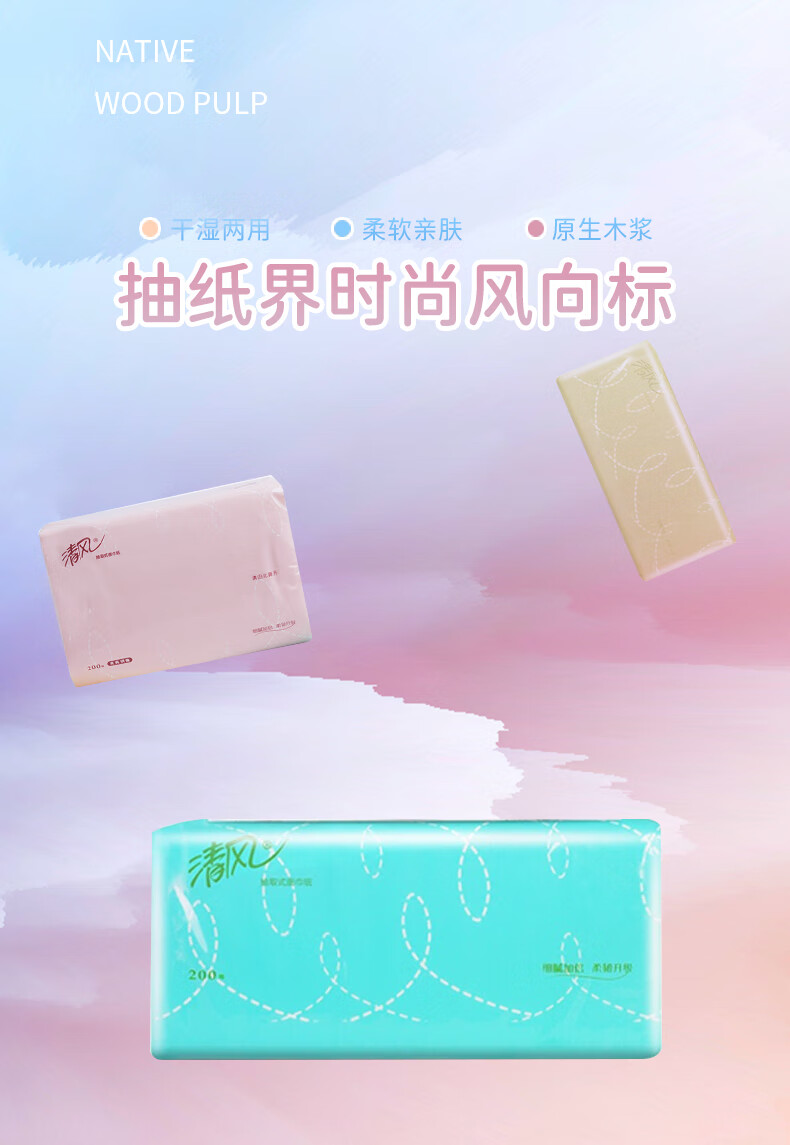 清風(fēng) 經(jīng)典抽紙三色糖果色原木小規(guī)格2層200抽家庭面巾餐巾衛(wèi)生手紙巾48包整箱BR38AC1