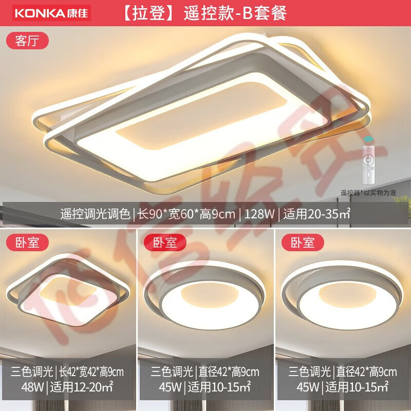 康佳(KONKA)LED吸頂燈客廳大燈臥室書房全屋燈具套餐【拉登】48瓦-三色調光 【拉登】 3室1廳 自營