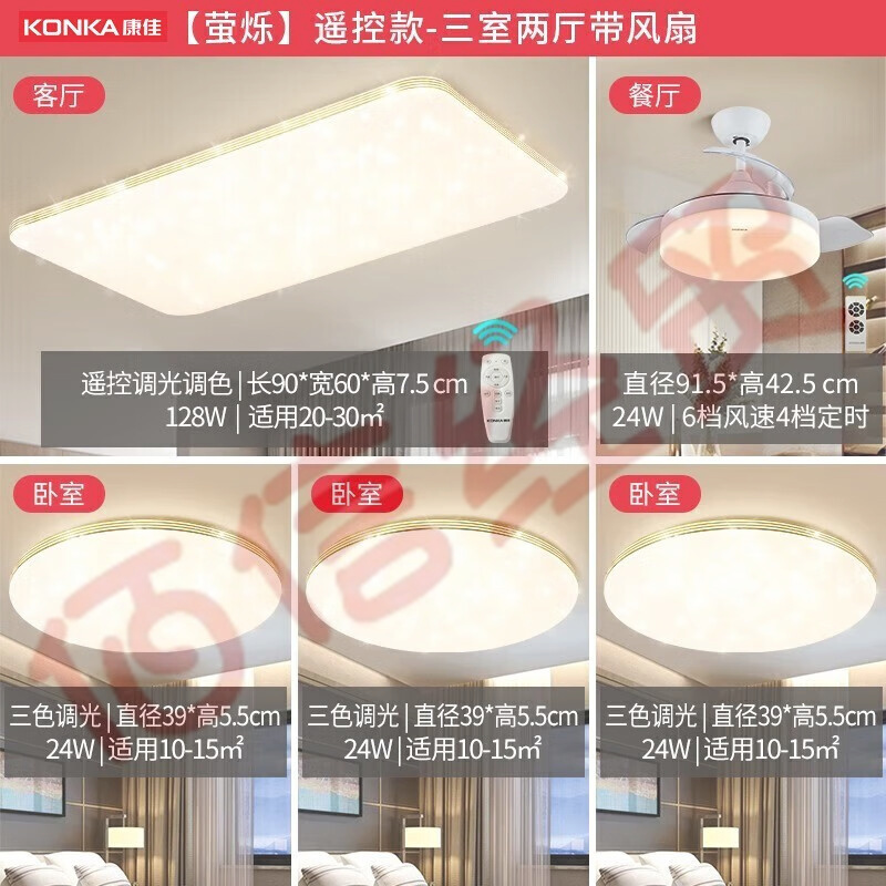 康佳(KONKA)客廳燈臥室護(hù)眼吸頂燈書房兒童房防藍(lán)光防頻閃led 3室2廳/帶風(fēng)扇 自營