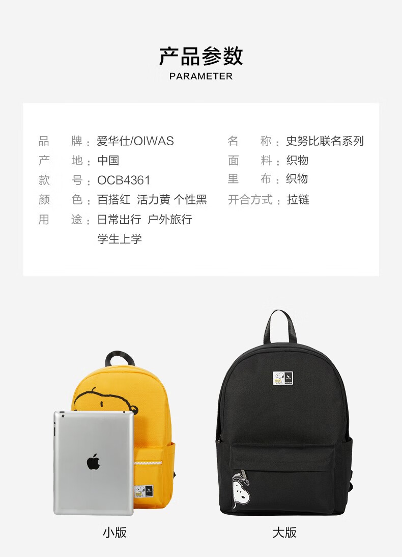 愛華仕史努比書包學(xué)生雙肩背包4361 OCB4361S小版 黑色、紅色、黃色 自營(yíng)