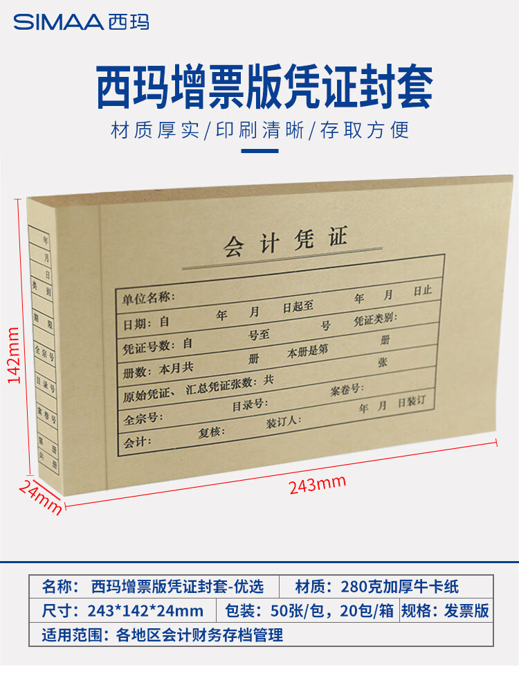 西瑪(SIMAA)增票規(guī)格連背憑證封面280g加厚牛皮紙發(fā)票版記賬封皮用友會(huì)計(jì)記賬封面FM128發(fā)票版封面243*142*24mm50張/包(五包起售) 自營