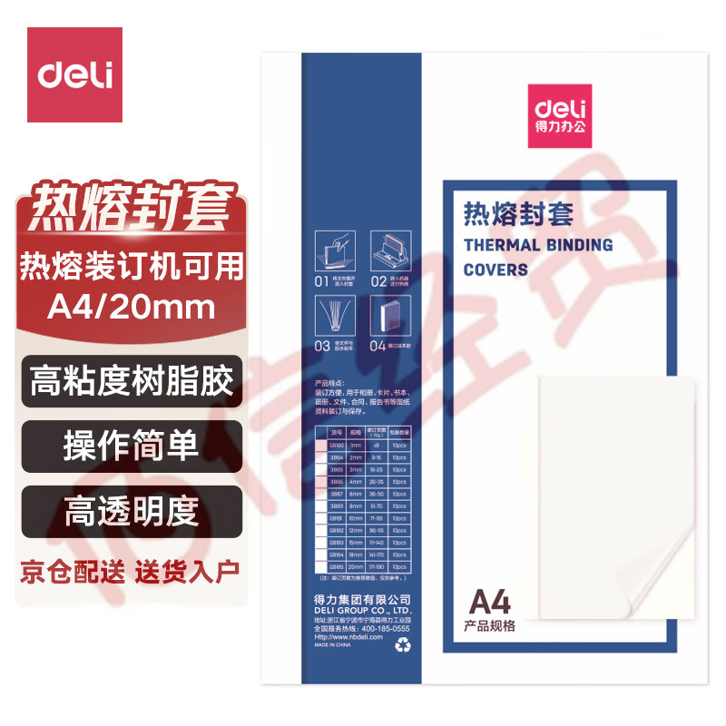 得力(deli)GB185熱熔封套熱熔裝訂機(jī)專(zhuān)用裝訂封皮A4/20mm(10個(gè)裝) 自營(yíng)