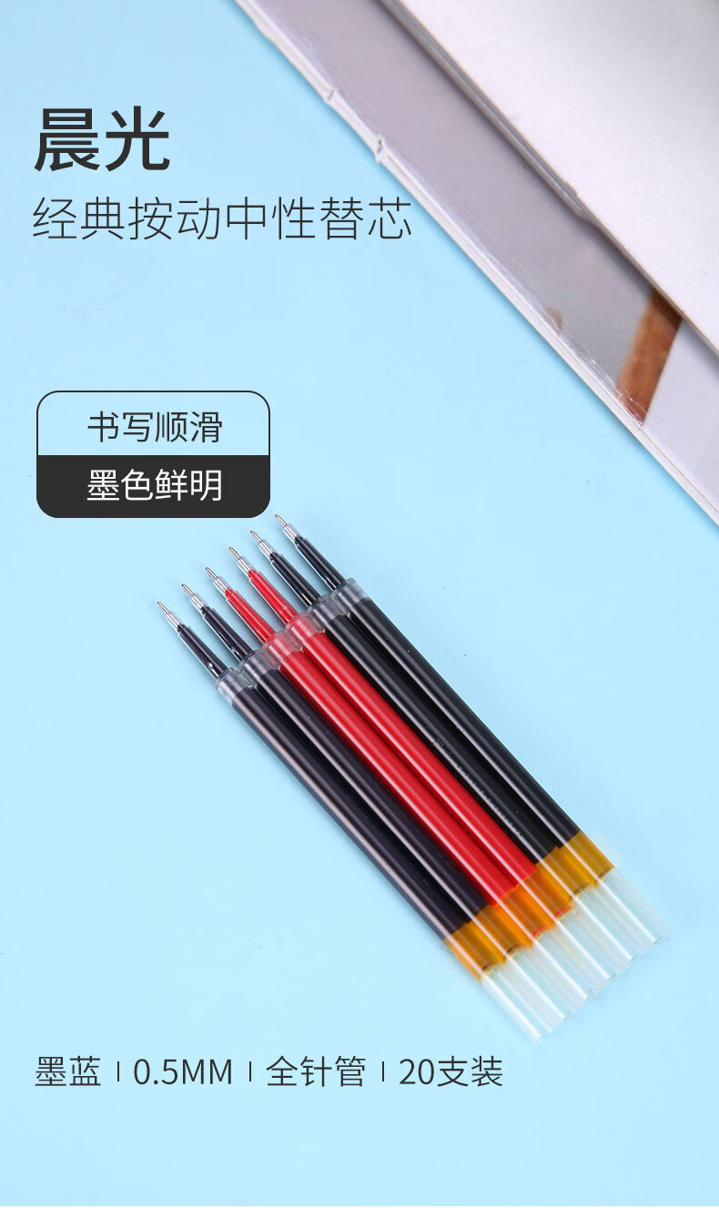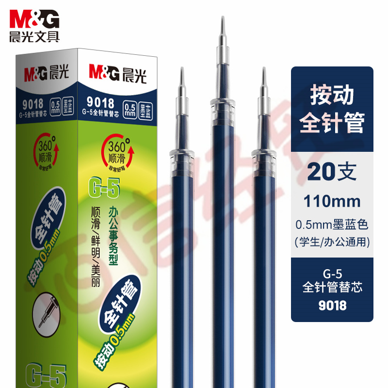 ■晨光墨藍色0.5mm中性筆按動簽字筆替芯 G-5全針管水筆芯 20支/盒9018B1 自營