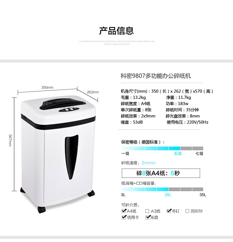 科密(comet)9807 5級(jí)保密辦公商用碎紙機(jī)(單次8張 持續(xù)35分鐘 26L 可碎卡、光盤)2022款 自營(yíng)