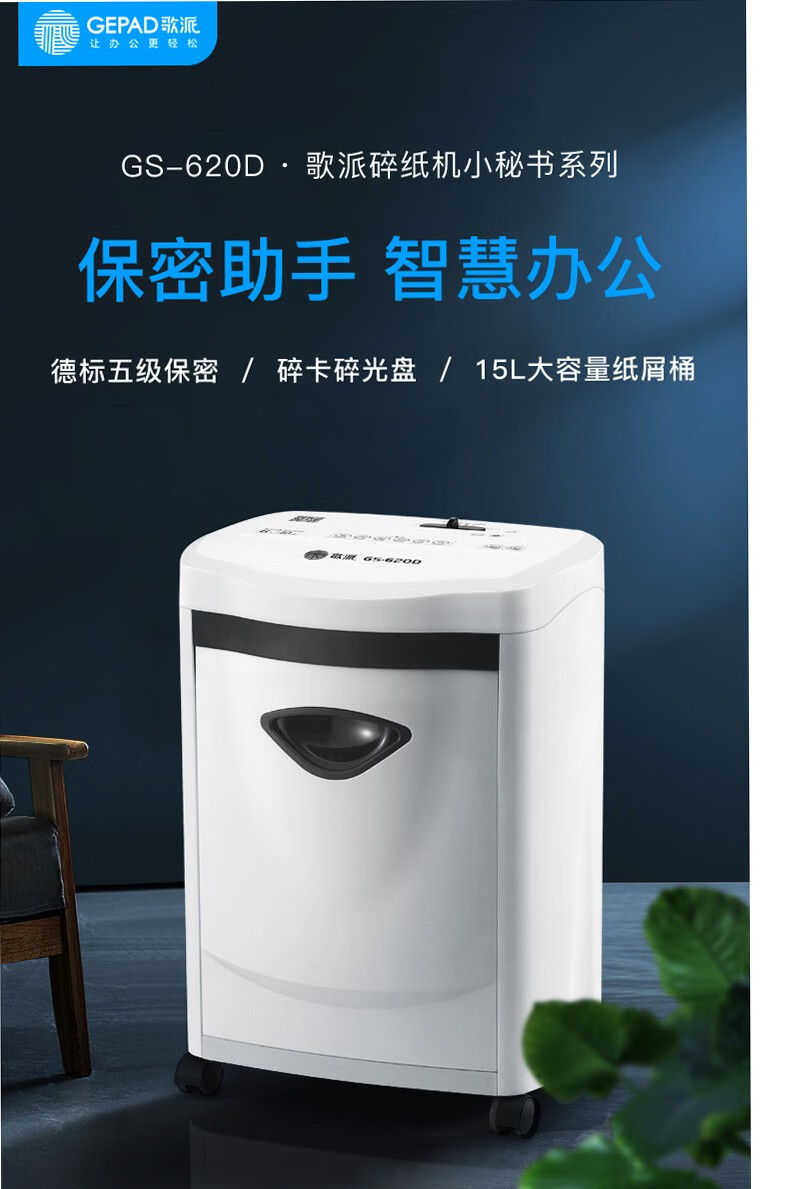 歌派(GEPAD)碎紙機(jī)GS-620D德國5級(jí)高保密辦公家用商用碎紙機(jī)小顆粒紙張粉碎機(jī) 碎卡碎光盤 自營
