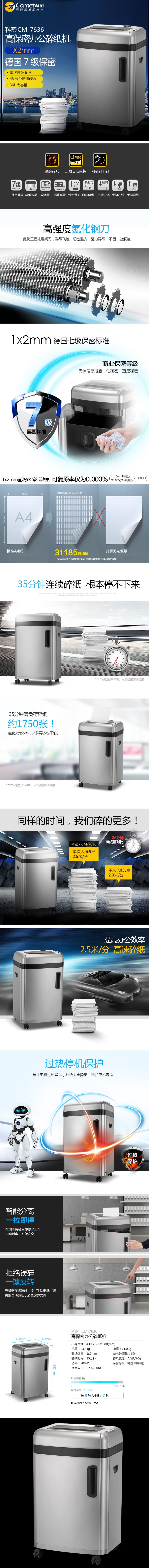 科密碎紙機CM-7636 7級保密辦公商用 單次6張 持續(xù)35分鐘 粉碎效果1mm*2mm 國保測認(rèn)證保密等級一級 36L 自營