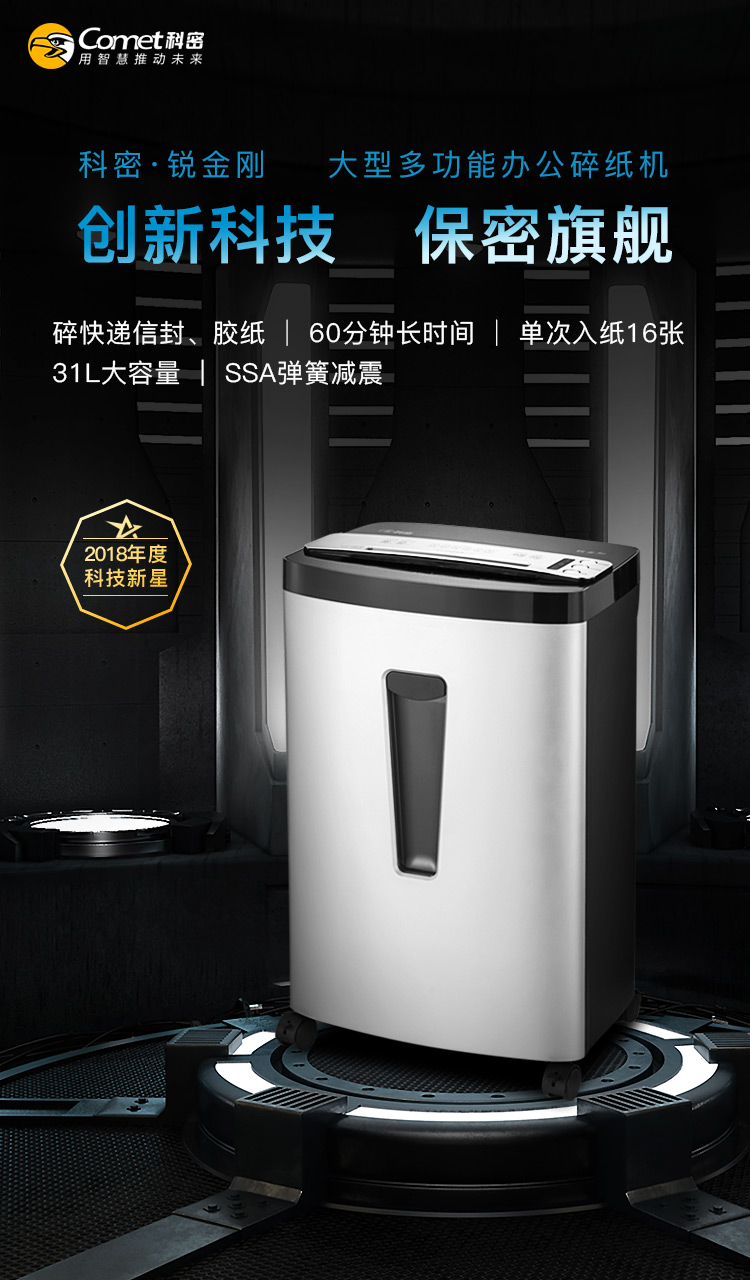 科密(comet)2021款辦公商用碎紙機(jī)(單次16張 持續(xù)60分鐘 31L 可碎卡、光盤、快遞紙盒、信封)銳金剛 自營