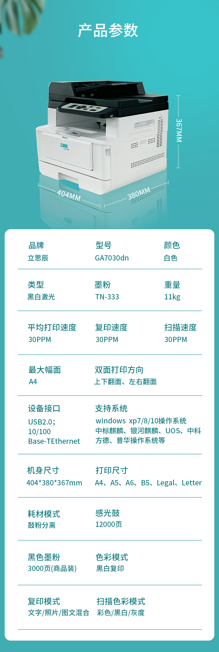 立思辰(LANXUM)A4黑白多功能一體機GA7030dn、打印/掃描/復印、網絡打印 自營